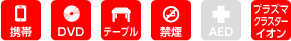 ●テレビ ●DVD・CDプレーヤー ●冷蔵庫 ●アイスストッカー ●湯沸器 ●通信カラオケ ●業務用無線 ●携帯電話 ●リクライニングシート ●サロンテーブル ●ビンゴゲーム ●ボディトランク(2個) ●プラズマクラスターイオン発生機(平成23年以降導入車両。お客さまのためにバス車内の空気を浄化し、明るく快適・清潔な車内を保ちます)